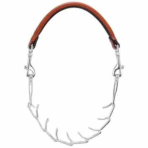 Weaver Leather Leather and Pronged Chain Goat Collar is a 5/8 in. goat collar is made from rolled chestnut bridle leather with smoothed and darkened edges and a 2.3 mm. chrome plated pronged chain that distributes pressure more evenly and gives you added control of the animal. The rolled bridle leather handle is soft, smooth and feels great in the hand. The chrome plated swivel snaps allow handle to be easily attached and detached from pronged chain. Overall length of collar includes handle.