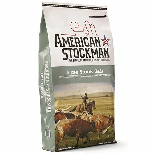 American Stockman Fine Stock Salt 50 Lb. is our most common white feed salt. It contains the anti-caking agent YPS. Supplementing livestock with salt is essential for optimal weight gain, milk production and overall health. Plus, providing minerals using salt has many other advantages. With the exception of water, animals' appetite for salt is second to none. This desire increases the intake of expensive nutrients included with the ration. This appetite also helps with herd location management. Cattle will naturally congregate around salt block placements.