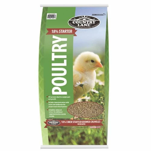 Country Lane® 18% Chick Starter/Grower Crumbles medicated feed designed to be fed to layer replacement pullets (1 day to 6 weeks old ) and broiler-type chicks ( 1 day old to finish ). Complete nutritionally balanced ration for optimum nutrition. Medicated to provide coccidiosis control. Uniform crumbles to encourage early consumption.
