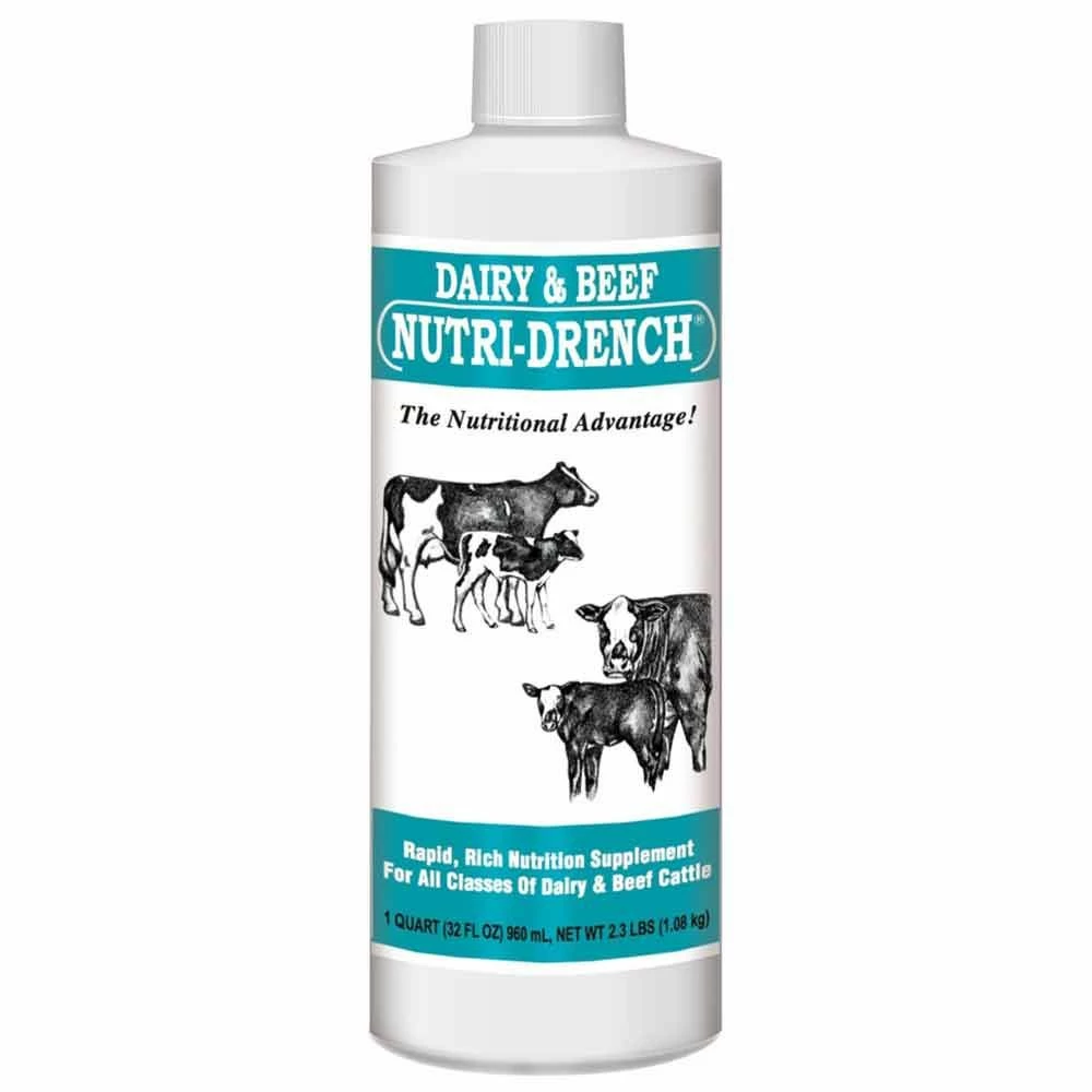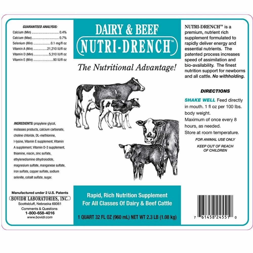 Dairy/Beef Nutri-Drench® is a premium, nutrient rich supplement formulated to rapidly deliver energy and essential nutrients. The patented process increases speed of assimilation and bio-availability. The finest nutrition support for newborns and all cattle. No withholding. Nutri Drench energizes week newborns, stimulates appetite, corrected diarrhea, maximizes antibiotic/vaccine response, balances immune systems, and quick energy for show. 99% retention of critical nutrients during scours. The first and only oral supplement to absorb from the stomach directly into the bloodstream in minutes. Feed directly in mouth. Nutri-Drench energizes weak newborns & promotes aggressive nursing. Nutri-Drench does not interfere with colostrum because it is absorbed to the bloodstream before reaching the intestines. Administer to all crias for a strong start. Energy level is low because the intestinal tract is inflamed & limits nutrients utilized through digestion when an animal has diarrhea. Nutri-Drench does not require digestion. It shunts to the bloodstream before reaching intestines with 99% utilization. During disease, in addition to going off feed, temperature increases normal energy needs by 40% – 50%, resulting in ketosis. Nutri-Drench quickly satisfies increased demands and returns normal nutrient balance. Most antibiotic or limited response to vaccine is the result of low blood glucose. Nutri-Drench elevates blood glucose in minutes. Administer approximately 15-20 minutes prior to antibiotic or vaccine. Any change of environment creates stress which causes an increased need for nutrients. Nutri-Drench quickly delivers replacement nutrition to return normal balance.