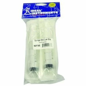 Ideal® 20cc Disposable Luer Slip Syringes 4 Pk. are packaged in a bag with a header card.