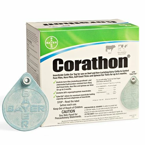 Corathon® Insecticide Cattle Ear Tags with FyberTek® can be used for both beef cattle and non-lactating dairy cattle. It controls horn flies, face flies, Gulf Coast ticks and spinose ear ticks for up to five months. Utilizes the Allflex® Universal Total Tagger.