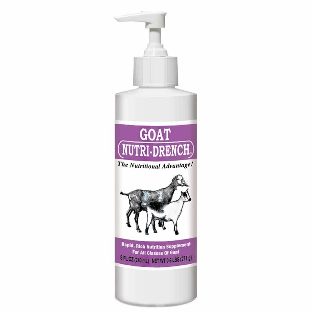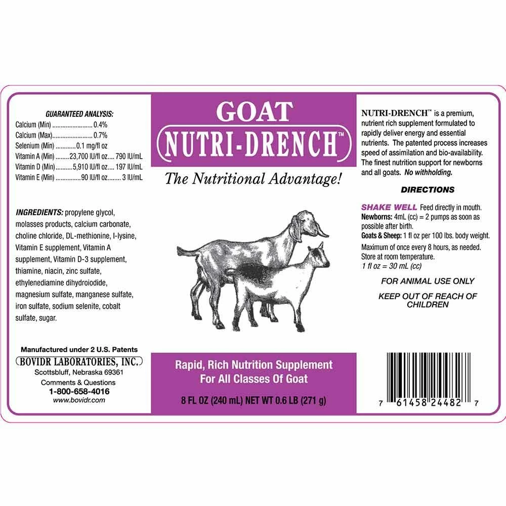 Goat Nutri-Drench® is a premium, nutrient rich supplement formulated to rapidly deliver energy and essential nutrients. The patented process increases speed of assimilation and bio-availability. The finest nutrition support for newborns and all goats. No digestion is required- Immediate nutrient balance delivers all vital nutrients to restore the immune system in minutes. Goat Nutri-Drench® is specially formulated for energizes weak newborns, stimulates appetite, correct diarrhea, maximizes antibiotic/vaccine response, balances immune system, relieves heat and shipping stress, and quick energy for show. Nutri-Drench is beneficial in any stress condition when energy/nutrient support is needed FAST! Finally, results you can see! Field tests prove that Nutri-Drench is in the bloodstream in minutes. Ordinary feed and supplements require 10-16 hours for digestion and absorption. Supplies the right nutrients, in the right balance, at the right time. Stress Dose: Give orally. Newborns: 4cc at birth. Adults: 1oz (30cc) per 100 lbs. body weight maximum of 1 treat every 8 hrs. for 3 days, as needed. Long Term/Maintenance Dose: May be mixed with water or food. 1/2 fl. oz. (15 cc) per 100 lbs. body weight 3-5 days per week. Adjust as needed.