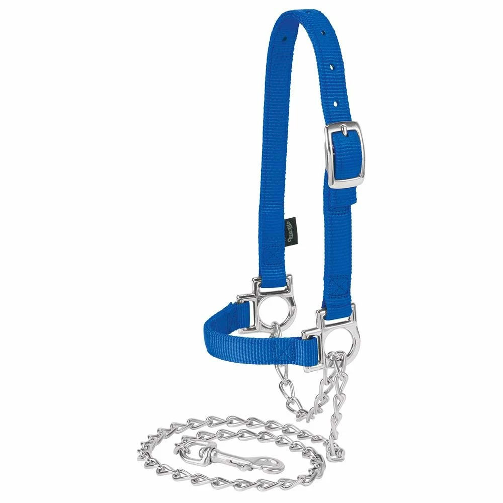 Weaver Leather Nylon Adjustable Sheep Halter with Chain Lead is constructed from 3/4 in. double and stiched nylon, this fully adjustable sheep halter featues a single buckle crown with seven holes to fit various sized of animals from show age lambs to adult sheep. The solid chain lead features a snap on the end to quickly and easily tie the animal to a pen or gate. For sae handling, a quick link on the chain securely attaches to the halter but still allows enough chain slack to easily slide the halter on and off.