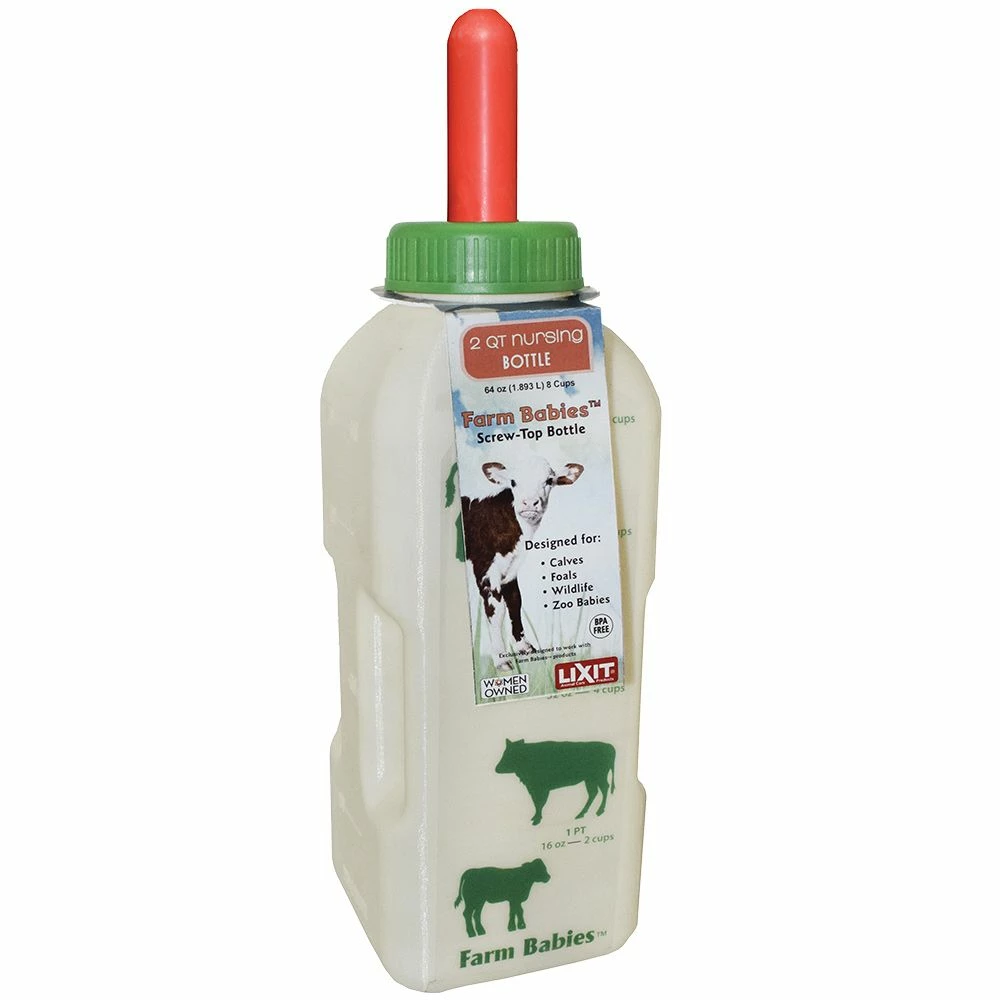 Lixit Farm Babies Nursing Bottle is a heavy duty, large capacity, 2 qt. nursing bottle for calves, wildlife and other farm babies. Bottle is designed with finger gripes making it easy to hold when calves are nursing. Less chances of bottle being dropped. The natural feeling nipple is specially designed to work with this bottle and securely attaches to the bottle with a neck ring. Neck ring makes nipple removal fast and easy.