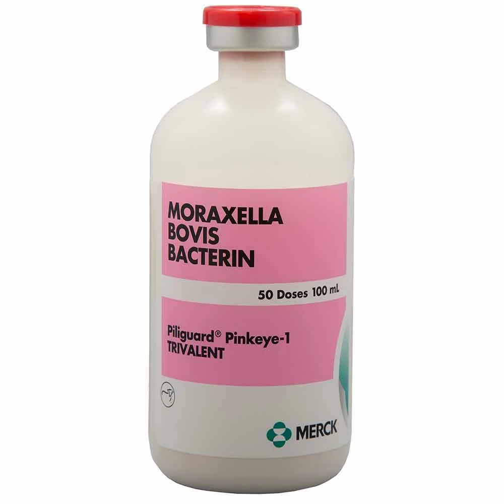 Merck PILIGUARD® Pinkeye-1 Trivalent is for use in healthy cattle to aid in the control of pinkeye associated with infection by Moraxella bovis. Use 3 to 6 weeks prior to onset of pinkeye season. An annual revaccination is recommended. Do not vaccinate within 60 days of slaughter. Transient local reaction may occur at the injection site. If anaphylaxis occurs administer epinephrine. Hypersensitivity reactions may occur with a biological product and can cause temporary reduced milk production in lactating cattle.