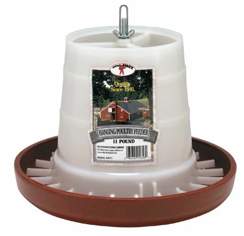 Little Giant Hanging Poultry Feeder holds 11 lbs. Feed saver lips minimize spillage. Features adjustable feed levels. Anti-scratch vanes help prevent crowding and feed waste.
