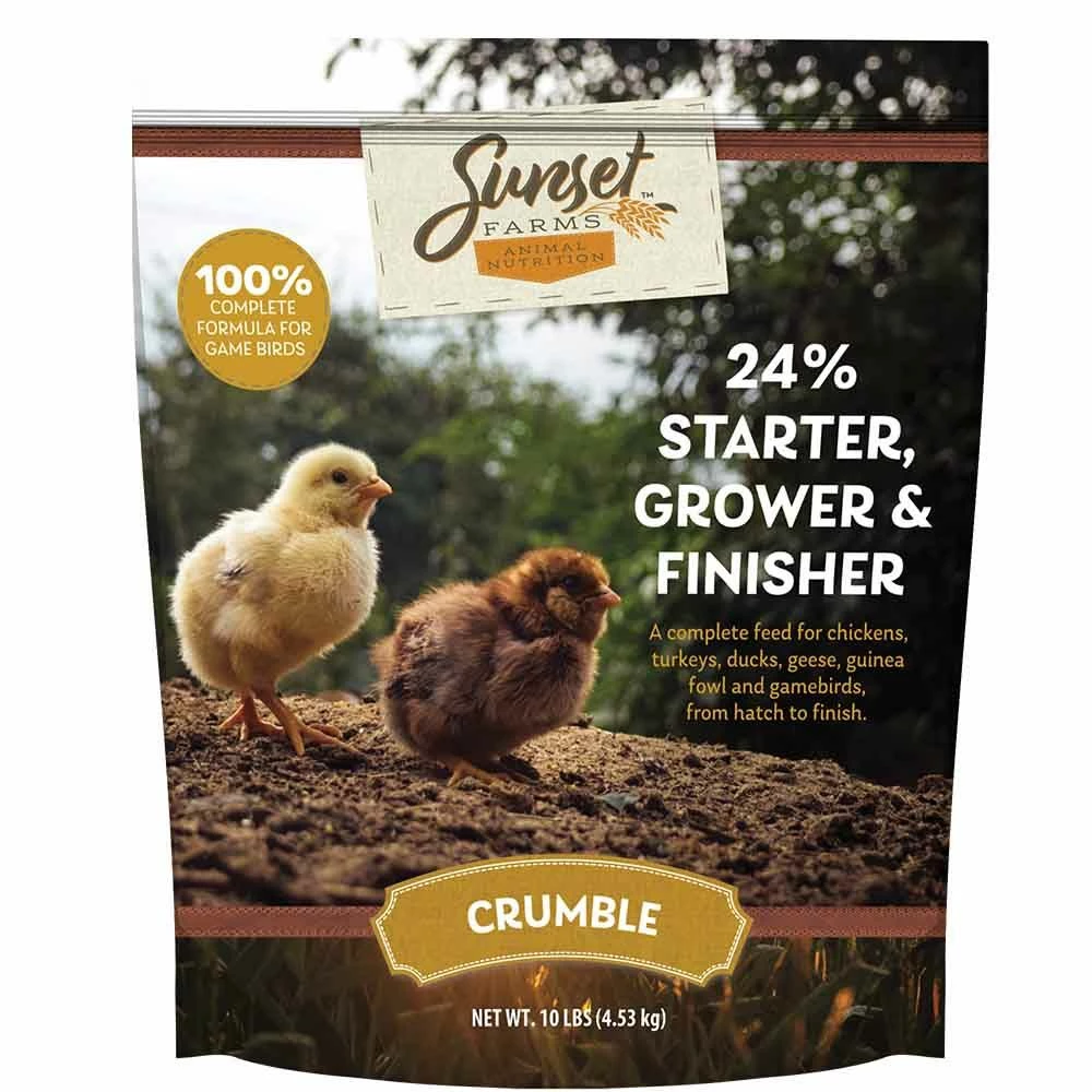 Sunset Farms™ Starter Grower & Finisher 24% is a complete feed for chickens, turkeys, ducks, geese, guinea fowl and gamebirds, from hatch to finish. Our non-medicated, antibotic-free formula provides optiomal nutrition in a crumble form. With the formulation for 3 phases of production in one, expect good performace and enhanced fortification for late stage growing.